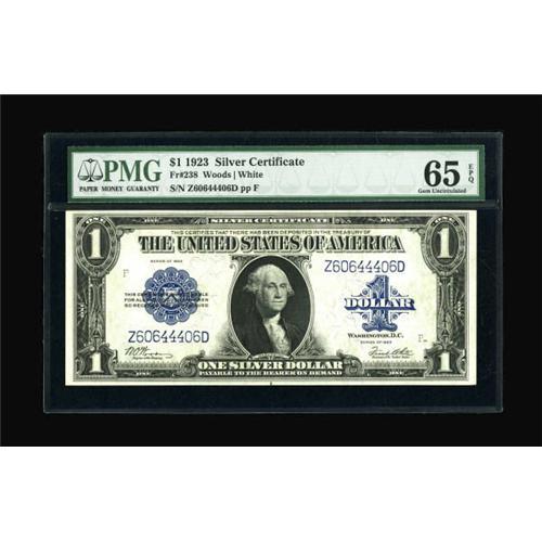 <B>Fr. 238 $1 1923 Silver Certificate PMG Gem Uncirculated 65 EPQ.</B></I> A nice representative of this less common signature combination.<BR><I>From The John Ameen Collection</B></I><BR><BR><b>Shipping:</b> Coins & Currency (<a target="_blank" href="http://www.heritageauctions.com/common/shipping.php">view shipping information</a>)