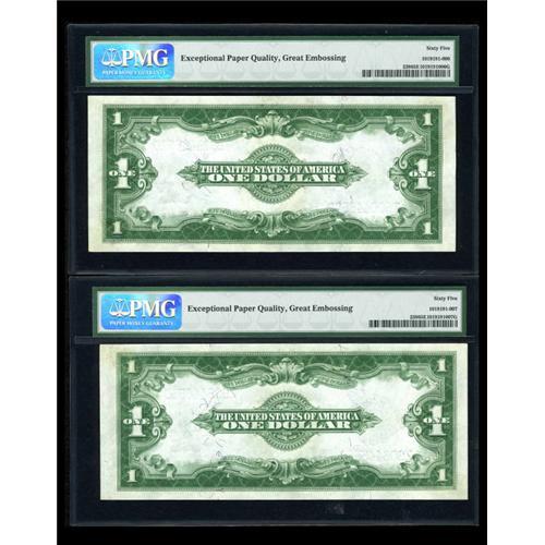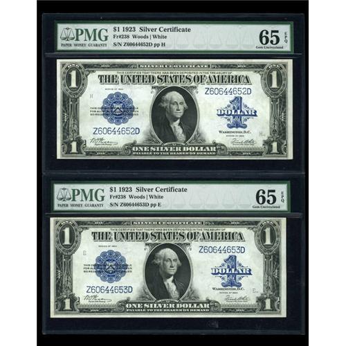 <B>Fr. 238 $1 1923 Silver Certificate PMG Gem Uncirculated 65 EPQ.</B></I> A consecutive pair, with both pieces graded <B>Gem Uncirculated 65 EPQ </B></I>by PMG.<BR><BR><b>Shipping:</b> Coins & Currency (<a target="_blank" href="http://www.heritageauctions.com/common/shipping.php">view shipping information</a>)