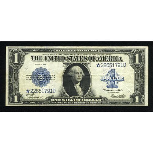 <B>Fr. 238 $1 1923 Silver Certificate Star Note Very Fine.</B></I> A most pleasing example of this replacement note. The paper is bright and the overprint remains a deep blue.<BR><BR><b>Shipping:</b> Coins & Currency (<a target="_blank" href="http://www.heritageauctions.com/common/shipping.php">view shipping information</a>)