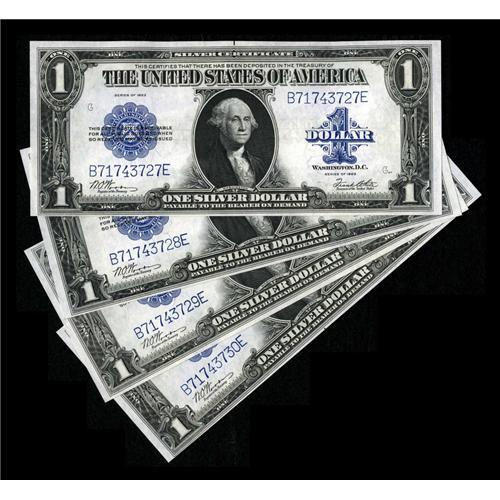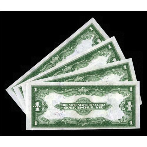 <B>Fr. 238 $1 1923 Silver Certificates Four Consecutive Examples Choice New.</B></I> The face plate letters on this consecutive foursome are G-H-E-F. These notes are from the 71,000,000 range of the B-E block. This was the last block for large size $1 Silvers and the serial numbers ended at just before 80,000,000.<BR><BR><b>Shipping:</b> Coins & Currency (<a target="_blank" href="http://www.heritageauctions.com/common/shipping.php">view shipping information</a>)