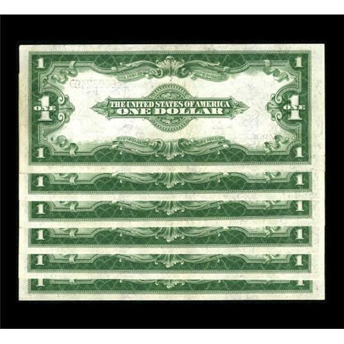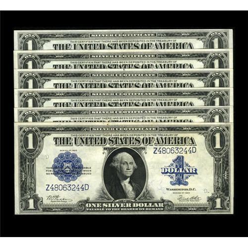 <B>Fr. 238 $1 1923 Silver Certificates Six Consecutive Examples Choice About New.</B></I> A cut sheet fills out the middle of this pleasing run of once folded blue seals with tremendous embossing.<BR><BR><b>Shipping:</b> Coins & Currency (<a target="_blank" href="http://www.heritageauctions.com/common/shipping.php">view shipping information</a>)