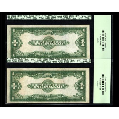 <B>Fr. 238/Fr. 237 $1 1923 Silver Certificates Reverse Changeover Pair PCGS Choice New 63.</B></I> This neat "Changeback" is one of only three such pairs we have had for auction in five years. Though not uncommon, these by no means are as common as some people may think.<BR><BR><b>Shipping:</b> Coins & Currency (<a target="_blank" href="http://www.heritageauctions.com/common/shipping.php">view shipping information</a>)