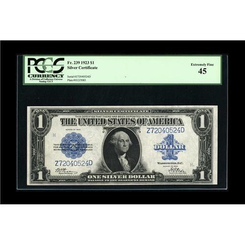 <B>Fr. 239 $1 1923 Silver Certificate PCGS Extremely Fine 45.</B></I> This piece clearly faces up as Very Choice New, though three faint folds prohibit the grade. A pleasing example of this scarce 1923 Silver Ace.