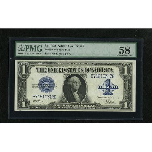 <B>Fr. 239 $1 1923 Silver Certificate PMG Choice About Unc 58.</B></I> An attractive, fully margined example of this Woods-Tate issue.<BR><BR><b>Shipping:</b> Coins & Currency (<a target="_blank" href="http://www.heritageauctions.com/common/shipping.php">view shipping information</a>)