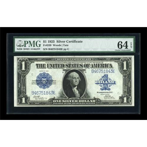 <B>Fr. 239 $1 1923 Silver Certificate PMG Choice Uncirculated 64 EPQ.</B></I> All the attributes of a fully Gem note held back by a bit of skew on the back. Bright and strongly embossed, this note should be a welcome addition to any collection.<BR><BR><b>Shipping:</b> Coins & Currency (<a target="_blank" href="http://www.heritageauctions.com/common/shipping.php">view shipping information</a>)
