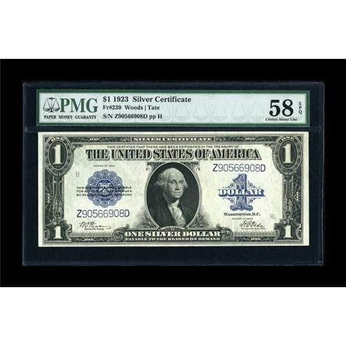 <B>Fr. 239 $1 1923 Silver Certificate PMG Choice About Unc 58 EPQ.</B></I> A light corner fold is noticed on this note from an elusive signature combination. The paper remains like new and the embossing is quite pronounced.<BR><BR><b>Shipping:</b> Coins & Currency (<a target="_blank" href="http://www.heritageauctions.com/common/shipping.php">view shipping information</a>)