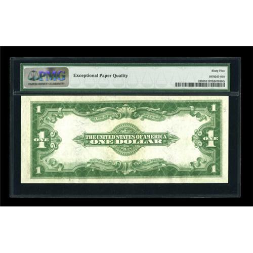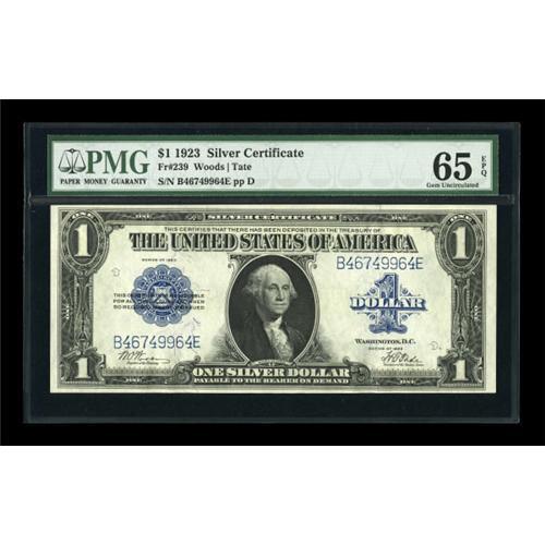 <B>Fr. 239 $1 1923 Silver Certificate PMG Gem Uncirculated 65 EPQ.</B></I> While certainly not rare in any real sense, with about 200 examples known, this is by far the rarest of the 1923 Ones. There are over 2,500 Fr. 237's and just over a thousand Fr 238's. This number, while outnumbered ten to one by Fr. 237, does not have its true scarcity reflected in its price. A really nice example, with great color and easily seen paper originality. <BR><I>From The John Ameen Collection</B></I><BR><BR><b>Shipping:</b> Coins & Currency (<a target="_blank" href="http://www.heritageauctions.com/common/shipping.php">view shipping information</a>)