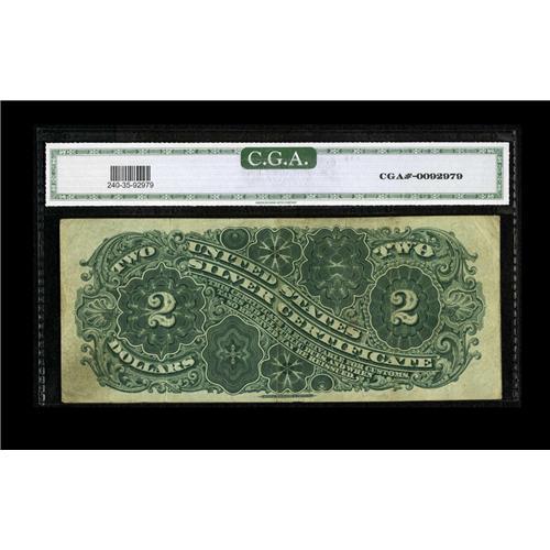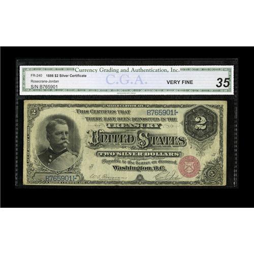 <B>Fr. 240 $2 1886 Silver Certificate CGA Very Fine 35.</B></I> The design on this mid-grade note remains strong as do the colors.
