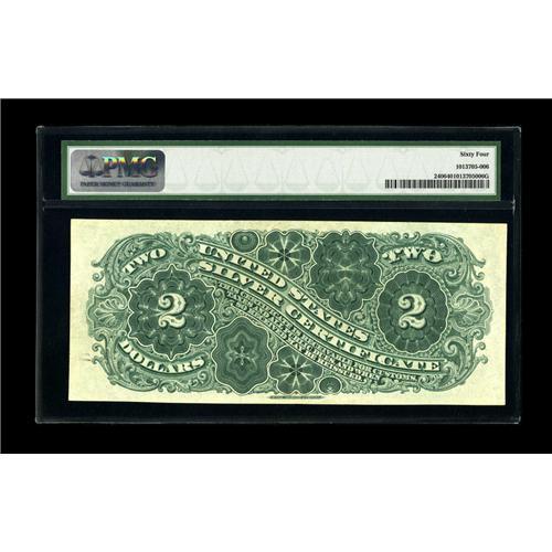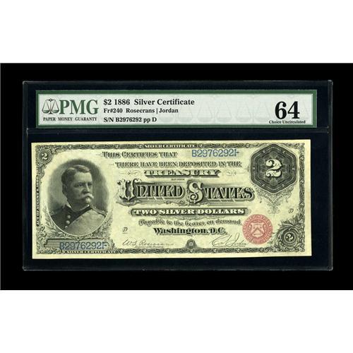 <B>Fr. 240 $2 1886 Silver Certificate PMG Choice Uncirculated 64.</B></I> Charles Schlecht's engraved portrait of General Winfield Scott Hancock appears on the face of this well conceived note. Our offerings of quality examples of this issue are less than one would expect. Certainly a colorful, well margined note likely to realize in the area of...<BR><BR><b>Shipping:</b> Coin/Currency (<a target="_blank" href="http://www.heritageauctions.com/common/shipping.php">view shipping information</a>)