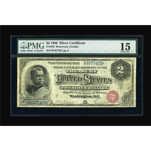 <B>Fr. 240 $2 1886 Silver Certificate PMG Choice Fine 15.</B></I> Problem-free, fully detailed and bright notes such as this tend to attract a lot of attention. This piece is a poster child for the perfect Fine grade.<BR><BR><b>Shipping:</b> Coins & Currency (<a target="_blank" href="http://www.heritageauctions.com/common/shipping.php">view shipping information</a>)