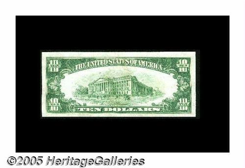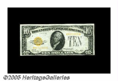<B>Fr. 2400 $10 1928 Gold Certificate. About Uncirculated.</B></I><BR>Fresh and bright, but with just a hint of a centerfold and a tight bottom margin.