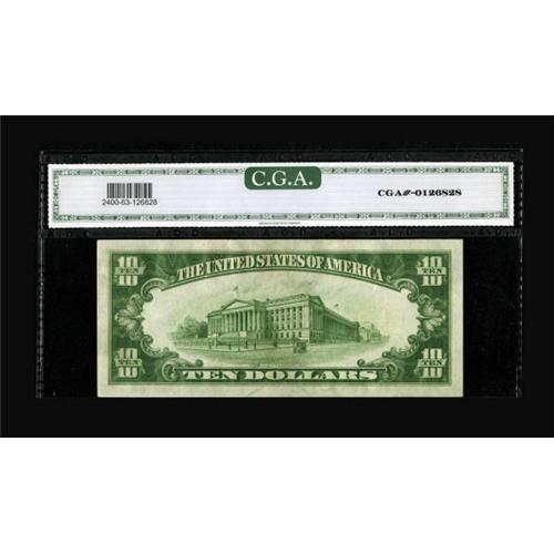 <B>Fr. 2400 $10 1928 Gold Certificate. CGA Choice Uncirculated 63.</B></I><BR> Original paper surfaces and an attractive orange overprint highlight this $10 Gold.<BR><BR><b>Shipping:</b> Coins & Currency (<a target="_blank" href="http://www.heritageauctions.com/common/shipping.php">view shipping information</a>)