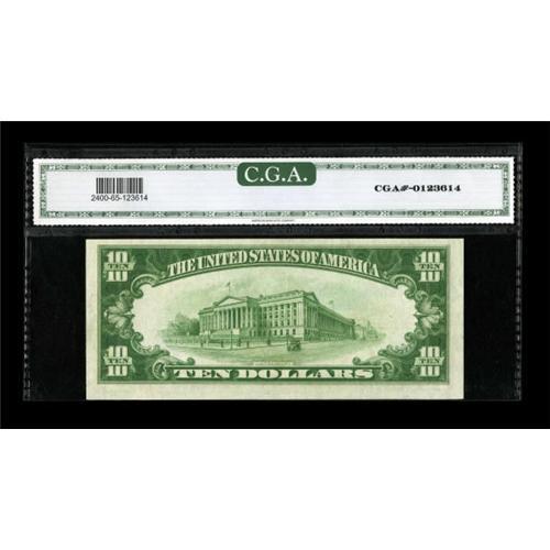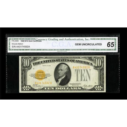 <B>Fr. 2400 $10 1928 Gold Certificate. CGA Gem Uncirculated 65.</B></I><BR> A touch of flatness is noticed on this colorful note.<BR><BR><b>Shipping:</b> Coins & Currency (<a target="_blank" href="http://www.heritageauctions.com/common/shipping.php">view shipping information</a>)