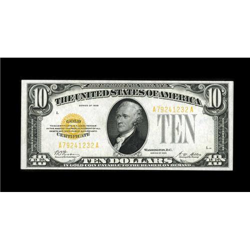 <B>Fr. 2400 $10 1928 Gold Certificate. Choice Crisp Uncirculated.</B></I><BR>Pristine surfaces are noticed on this bright note. Nicely margined and crisp, the colors dazzle the casual observer.<BR><BR><b>Shipping:</b> Coin/Currency (<a target="_blank" href="http://www.heritageauctions.com/common/shipping.php">view shipping information</a>)