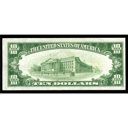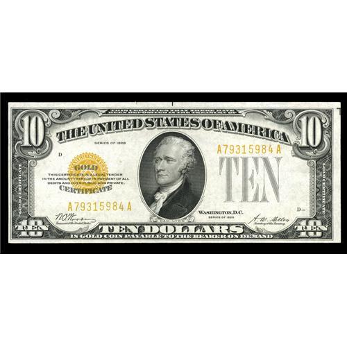 <B>Fr. 2400 $10 1928 Gold Certificate. Choice Crisp Uncirculated.</B></I><BR>Two wide and two narrow margins define this $10 Gold with a dark third printing.