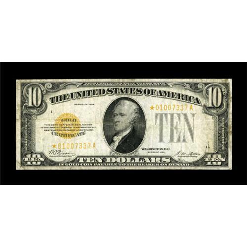 <B>Fr. 2400* $10 1928 Gold Certificate. Fine+.</B></I><BR> This replacement Gold will not break the bank. A light washing is evident. <BR><BR><b>Shipping:</b> Coins & Currency (<a target="_blank" href="http://www.heritageauctions.com/common/shipping.php">view shipping information</a>)