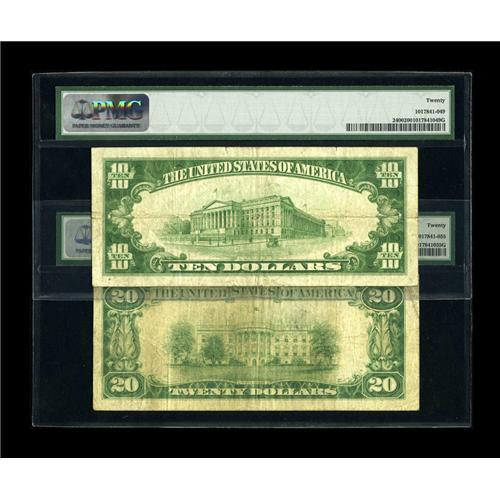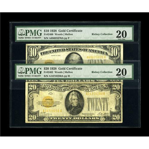 <B>Fr. 2400 $10 1928 Gold Certificate, Fr. 2402 $20 Gold Certificate PMG Very Fine 20.</B></I><BR>This is an evenly matched pair of lightly circulated notes that continue to gain in popularity.<BR><BR><b>Shipping:</b> Coin/Currency (<a target="_blank" href="http://www.heritageauctions.com/common/shipping.php">view shipping information</a>)