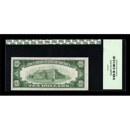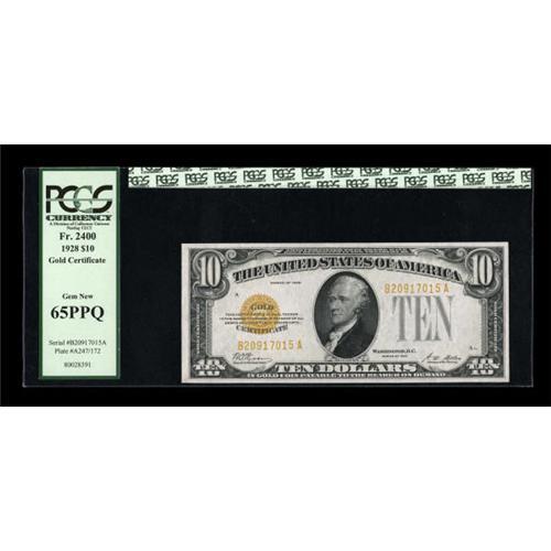 <B>Fr. 2400 $10 1928 Gold Certificate. PCGS Gem New 65PPQ.</B></I><BR> This attractive note hails from the elusive B-A block and ranks as one of the finest for this tough issue. <BR><BR><b>Shipping:</b> Coins & Currency (<a target="_blank" href="http://www.heritageauctions.com/common/shipping.php">view shipping information</a>)