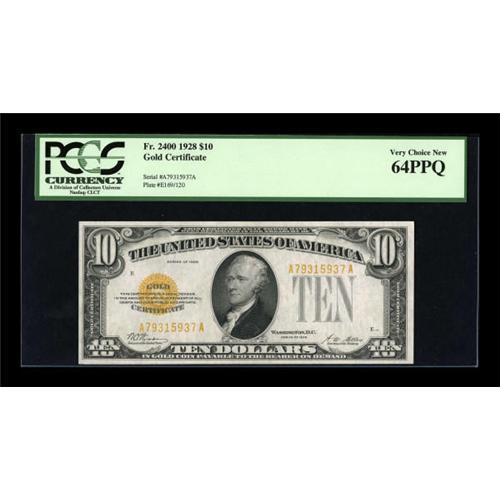 <B>Fr. 2400 $10 1928 Gold Certificate. PCGS Very Choice New 64PPQ.</B></I><BR> Plenty of embossing is visible beneath the holder on this eye appealing Gold Seal.<BR><I>From The Drew Keough Collection</B></I><BR><BR><b>Shipping:</b> Coins & Currency (<a target="_blank" href="http://www.heritageauctions.com/common/shipping.php">view shipping information</a>)