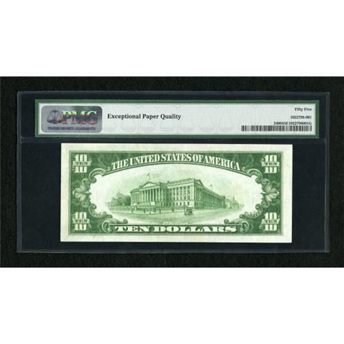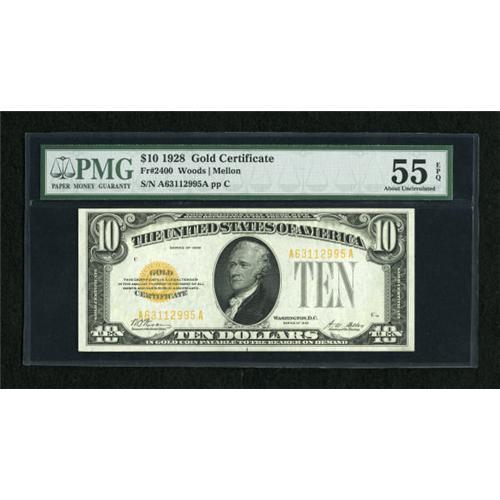 <B>Fr. 2400 $10 1928 Gold Certificate. PMG About Uncirculated 55 EPQ.</B></I><BR> A well centered and very attractive example of this popular gold type.<BR><BR><b>Shipping:</b> Coins & Currency (<a target="_blank" href="http://www.heritageauctions.com/common/shipping.php">view shipping information</a>)