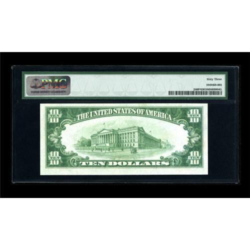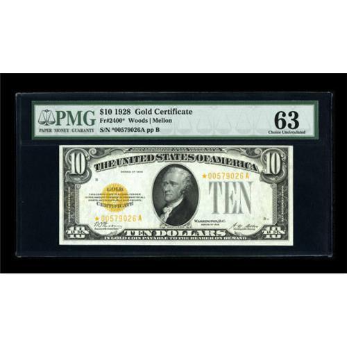 <B>Fr. 2400* $10 1928 Gold Certificate. PMG Choice Uncirculated 63.</B></I><BR> The color on this note remains bright. Few uncirculated survivors make up the total population for this desirable series.<BR><BR><b>Shipping:</b> Coins & Currency (<a target="_blank" href="http://www.heritageauctions.com/common/shipping.php">view shipping information</a>)