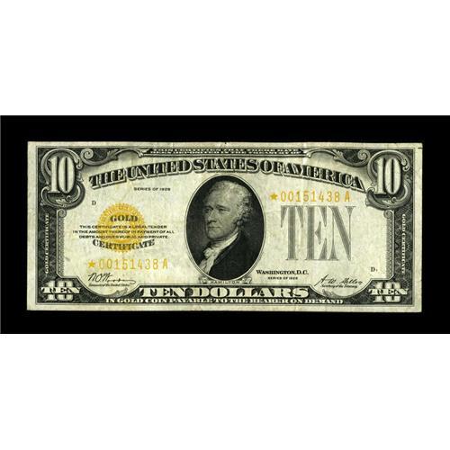 <B>Fr. 2400* $10 1928 Gold Certificate. Very Fine.</B></I><BR>Sound edges and full margins encircle this star<BR><I>From The Bill and Kathy Stella Currency Collection</B></I><BR><BR><b>Shipping:</b> Coin/Currency (<a target="_blank" href="http://www.heritageauctions.com/common/shipping.php">view shipping information</a>)