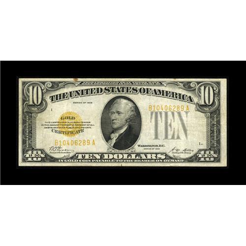<B>Fr. 2400 $10 1928 Gold Certificate. Very Fine+.</B></I><BR>The B-A Block is not as readily available as the A-A. This example remains crisp with a vivid overprint.