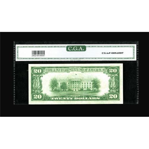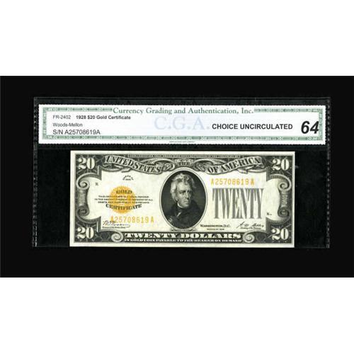 <B>Fr. 2402 $20 1928 Gold Certificate. CGA Choice Uncirculated 64.</B></I><BR> The margins are ample on all sides except one. Overall, the eye appeal is ideal, including a bold gold overprint.<BR><BR><b>Shipping:</b> Coins & Currency (<a target="_blank" href="http://www.heritageauctions.com/common/shipping.php">view shipping information</a>)