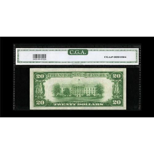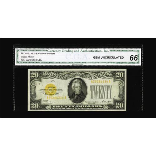 <B>Fr. 2402 $20 1928 Gold Certificate. CGA Gem Uncirculated 66.</B></I><BR>Bright overprints grace this well margined note.