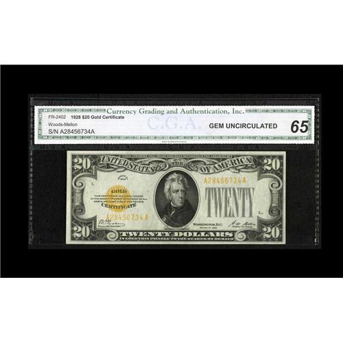 <B>Fr. 2402 $20 1928 Gold Certificate. CGA Gem Uncirculated 65.</B></I><BR>Another pristine example of this popular type.