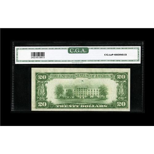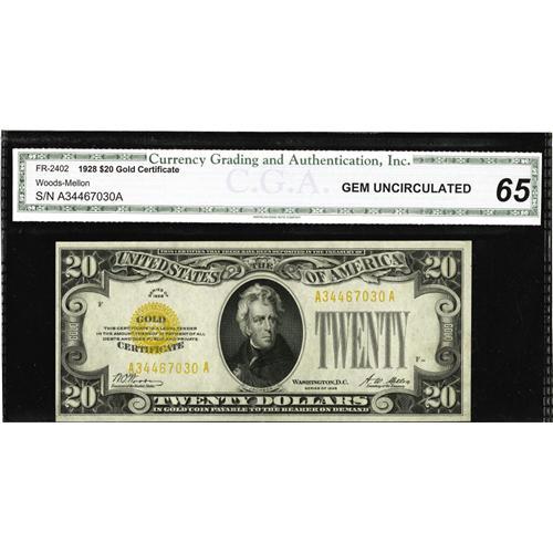 <B>Fr. 2402 $20 1928 Gold Certificate. CGA Gem Uncirculated 65.</B></I><BR>The 1928 Gold Certificate series has long been a favorite of collectors, especially in such extraordinarily nice condition.