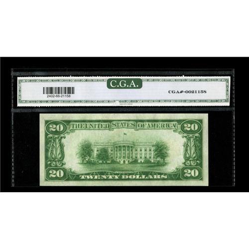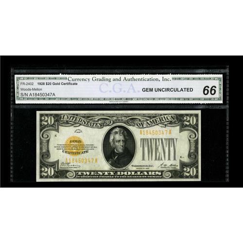 <B>Fr. 2402 $20 1928 Gold Certificate. CGA Gem Uncirculated 66.</B></I><BR>Rich golden color and pleasing paper waves are noted on this $20 Gold.<BR><BR><b>Shipping:</b> Coins & Currency (<a target="_blank" href="http://www.heritageauctions.com/common/shipping.php">view shipping information</a>)