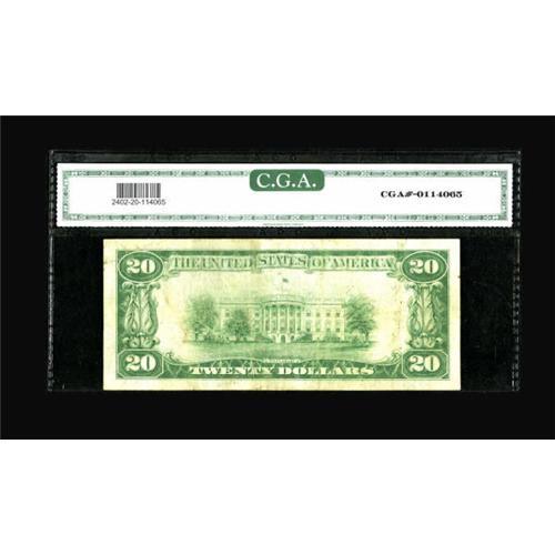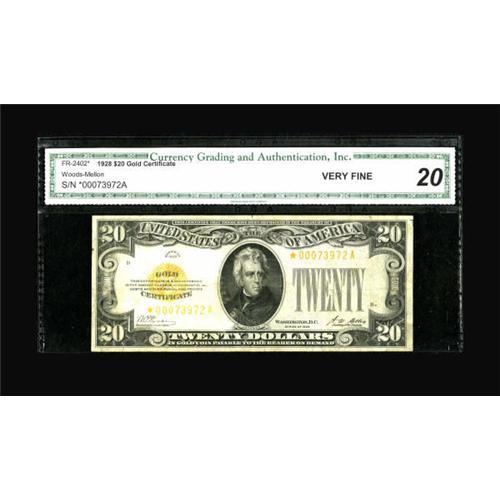 <B>Fr. 2402* $20 1928 Gold Certificate. CGA Very Fine 20.</B></I><BR> The overprint remains bright on this always popular replacement note issue.<BR><BR><b>Shipping:</b> Coins & Currency (<a target="_blank" href="http://www.heritageauctions.com/common/shipping.php">view shipping information</a>)