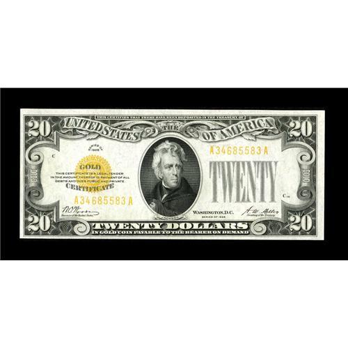 <B>Fr. 2402 $20 1928 Gold Certificate. Choice Crisp Uncirculated.</B></I><BR>The eye appeal of this note is exemplary with deep color in the overprint. Plenty of embossing demonstrates originality while an as made vertical paper wrinkle transects the portrait.<BR><BR><b>Shipping:</b> Coins & Currency (<a target="_blank" href="http://www.heritageauctions.com/common/shipping.php">view shipping information</a>)