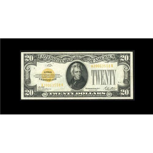 <B>Fr. 2402 $20 1928 Gold Certificate. Extremely Fine-About Uncirculated.</B></I><BR>Well centered and very lightly circulated.