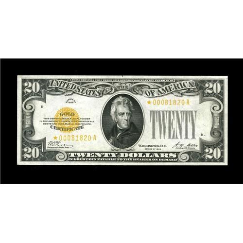 <B>Fr. 2402* $20 1928 Gold Certificate. Extremely Fine.</B></I><BR>This is a lovely star example with great color and the appearance of an uncirculated note until closely examined.