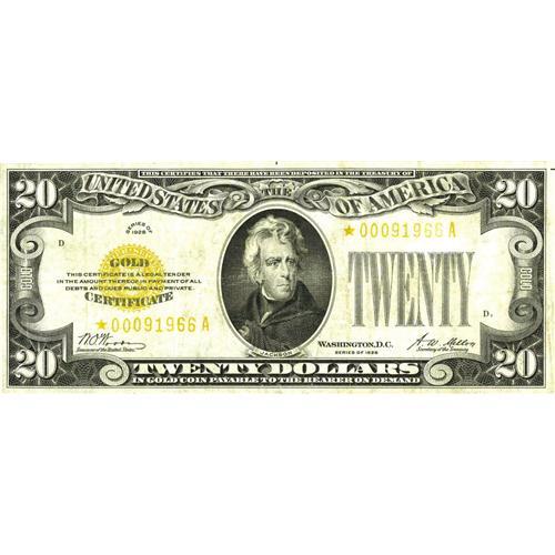 <B>Fr. 2402* $20 1928 Gold Certificate. Fine-Very Fine.</B></I><BR>This example of this popular replacement though well margined looks to have been wet.