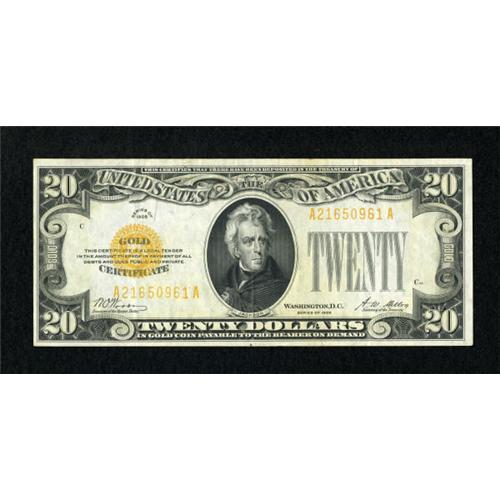 <B>Fr. 2402 $20 1928 Gold Certificate. Fine-Very Fine.</B></I><BR> A couple of minor problems affect this note in the form of a small hole and a tiny repaired margin notch. Otherwise the paper quality is closer to that of the higher of the split grade.<BR><BR><b>Shipping:</b> Coins & Currency (<a target="_blank" href="http://www.heritageauctions.com/common/shipping.php">view shipping information</a>)