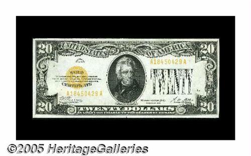<B>Fr. 2402 $20 1928 Gold Certificate. Gem Crisp Uncirculated.</B></I><BR>The first of a group of four consecutive $20 Golds, each a fully embossed and fully original example which easily makes the gem grade.