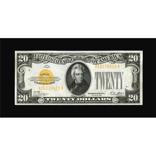 <B>Fr. 2402 $20 1928 Gold Certificate. Gem Crisp Uncirculated.</B></I><BR> Another gem from the Ameen holdings, with this piece a crackling fresh and well embossed beauty. The centering here is better than average, and the presence of one light handling mark amounts to a miniscule distraction. <BR><I>From The John Ameen Collection</B></I><BR><BR><b>Shipping:</b> Coins & Currency (<a target="_blank" href="http://www.heritageauctions.com/common/shipping.php">view shipping information</a>)