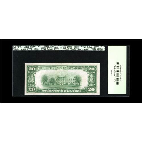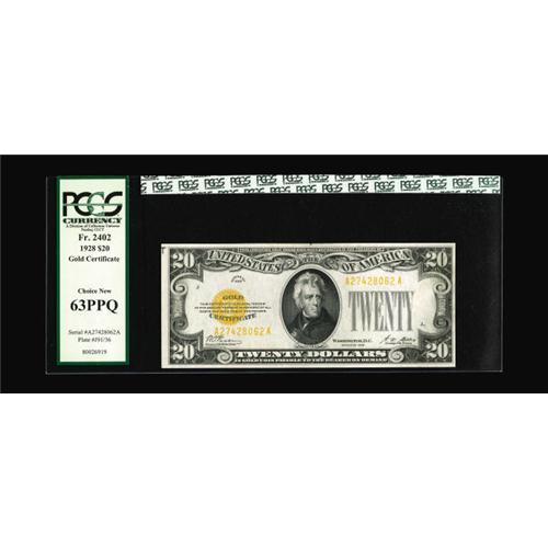 <B>Fr. 2402 $20 1928 Gold Certificate. PCGS Choice New 63PPQ.</B></I><BR>Brightly colored but lacking the centering to merit a higher grade.
