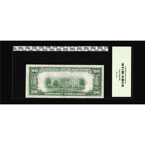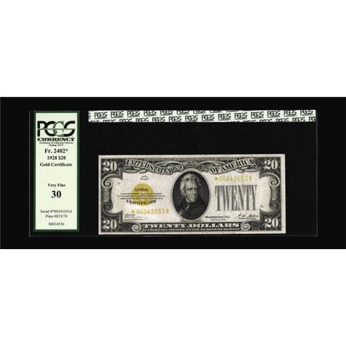 <B>Fr. 2402* $20 1928 Gold Certificate. PCGS Very Fine 30.</B></I><BR>This is a tougher star to acquire. This example has been third-party graded and a couple of pinholes in the portrait are noticed.