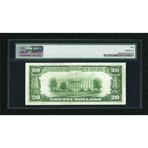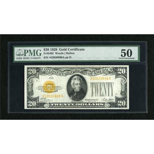 <B>Fr. 2402 $20 1928 Gold Certificate. PMG About Uncirculated 50.</B></I><BR> A well margined and colorful example of this gold certificate that does have a small edge nick in the top border.<BR><BR><b>Shipping:</b> Coins & Currency (<a target="_blank" href="http://www.heritageauctions.com/common/shipping.php">view shipping information</a>)