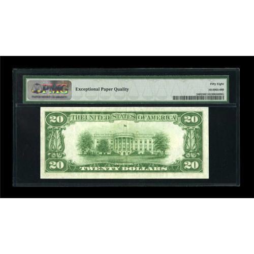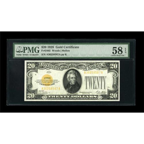 <B>Fr. 2402 $20 1928 Gold Certificate. PMG Choice About Unc 58.</B></I><BR> Some light handling and a center bend are noted.<BR><BR><b>Shipping:</b> Coins & Currency (<a target="_blank" href="http://www.heritageauctions.com/common/shipping.php">view shipping information</a>)