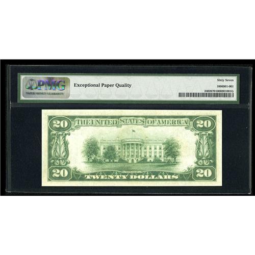 <B>Fr. 2402 $20 1928 Gold Certificate. PMG Superb Gem Uncirculated 67.</B></I><BR>This piece comes from the same collection as the gorgeous $50 PMG 67 Gold Note below. Both holders are labeled "Exceptional Paper Quality," which is likely to be an uncommon designation for most Series 1928 Gold Certificates.