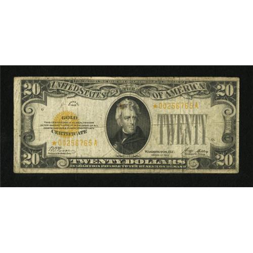 <B>Fr. 2402* $20 1928 Gold Certificate Star. Very Good-Fine.</B></I><BR> This is an elusive note in any condition. A small spot is in Jackson's hair.<BR><BR><b>Shipping:</b> Coins & Currency (<a target="_blank" href="http://www.heritageauctions.com/common/shipping.php">view shipping information</a>)
