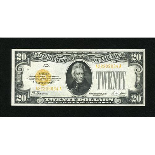 <B>Fr. 2402 $20 1928 Gold Certificate. Very Choice Crisp Uncirculated.</B></I><BR>This is a very attractive and utterly original gold certificate that has great embossing and spectacular eye appeal.<BR><I>From The Collection of Greg Southward</B></I><BR><BR><b>Shipping:</b> Coins & Currency (<a target="_blank" href="http://www.heritageauctions.com/common/shipping.php">view shipping information</a>)
