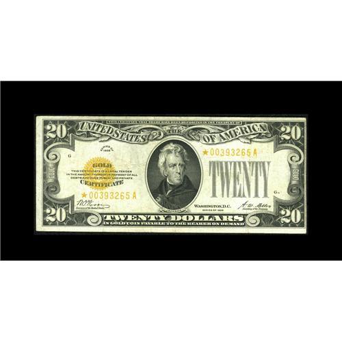 <B>Fr. 2402* $20 1928 Gold Certificate. Very Fine.</B></I><BR>A trace of embossing and even handling are noticed on this elusive $20 Gold Star. Gold Stars continue their upward ride.