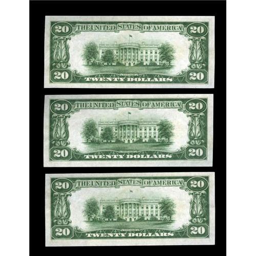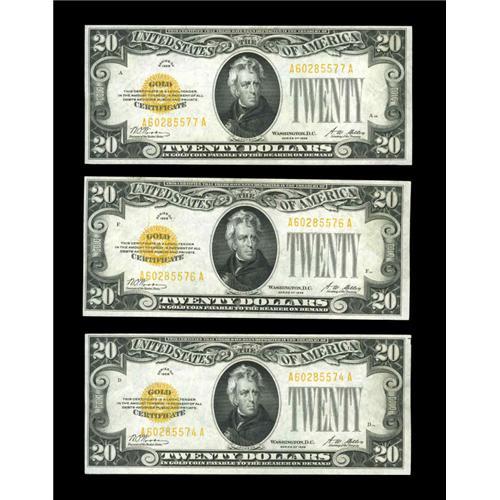 <B>Fr. 2402 $20 1928 Gold Certificates. About Uncirculated.</B></I><BR>A trio of $20 Gold Certificates, two of which are consecutive. All three are bright, attractive, and fully original, but all have just too much handling to describe as uncirculated.