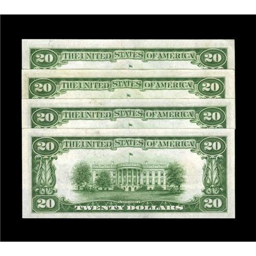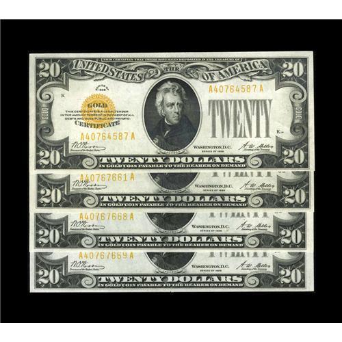 <B>Fr. 2402 $20 1928 Gold Certificates. Four Examples Extremely Fine-About Uncirculated.</B></I><BR>Excellent embossing remains on these vividly hued notes that have a bit too much handling for the higher of the split grade.